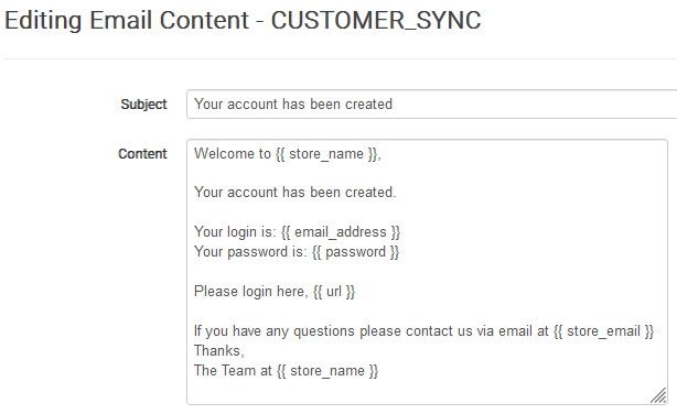 Find the 'CUSTOMER_SYNC' email and click on 'Your account has been created'. Note that this is the subject of the email and this text will be updated if somebody has already changed it.