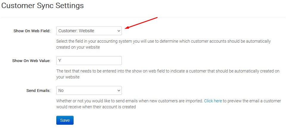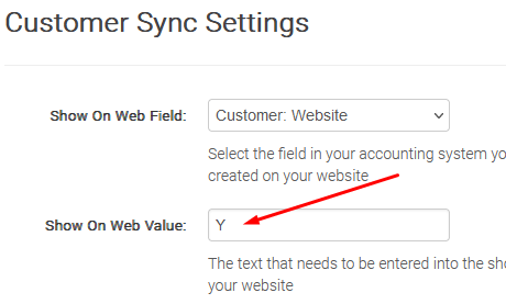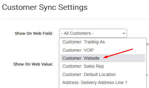 Show on Web Field - Click on the drop down menu and select the field you nominated as the web flag in step 1. This flag determines which field you use in the Infusion account to flag customer accounts for the website. In the drop down field, select 'Website'.