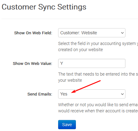 Send Emails - This field turns on the welcome email that is sent from the site to the customer, when the customer's account is imported to the admin area for the first time. It's recommended to first test the customer import with this setting to No and then when you're ready to test the email, update this setting to Yes.