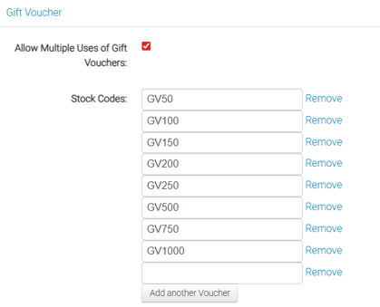 Once you've done this, add the gift voucher stock code/s to the payment methods page (https://yourdomain/admin/store/payment)