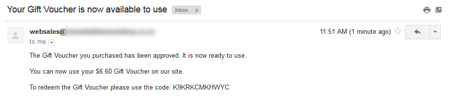 This will send the customer an email, notifying them that their Gift Voucher is available to use and confirming the gift voucher code.