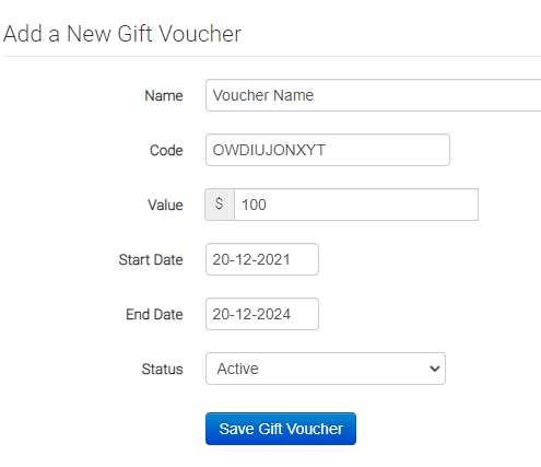 The gift voucher will be in the state of 'Pending' requiring you to make the voucher active or inactive. You will also notice that there is a code assigned to the voucher. Update the voucher to 'Active' and click the 'Save Gift Voucher' button.