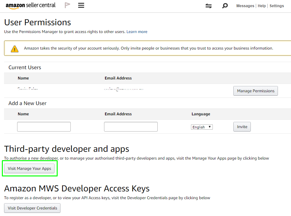 - Scroll down to the "Third-party developer and apps" section - per the screenshot below - click on the "Visit Manage Your Apps" button: